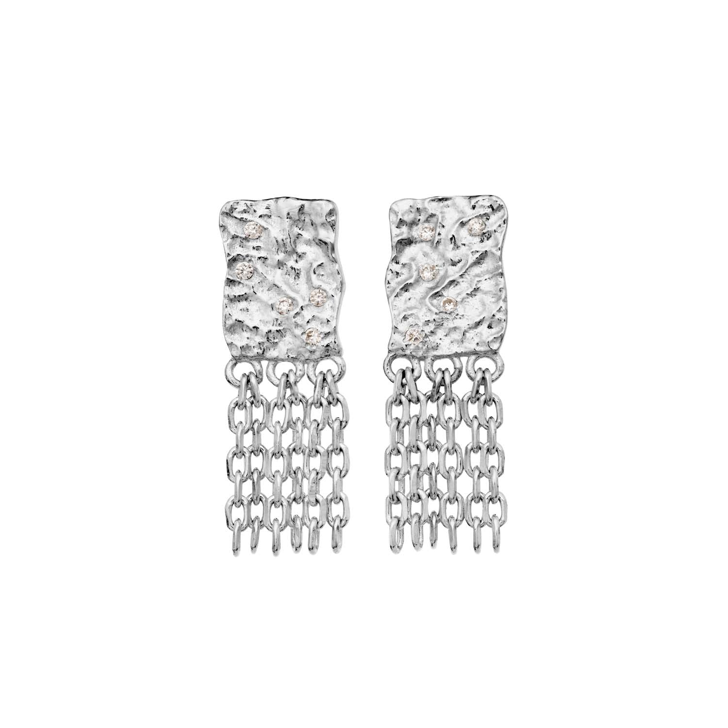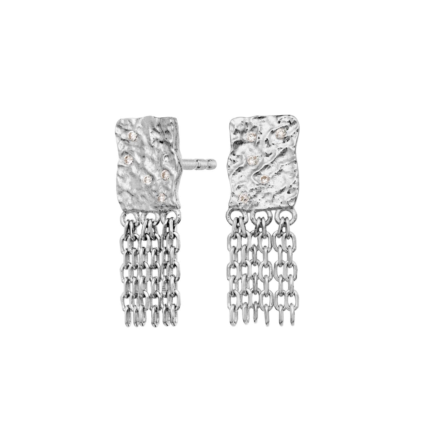 Örhängena är tillverkade av glänsande silver som fångar ljuset på ett sätt som framhäver deras unika textur. De fina kedjorna som hänger från örhängena ger en dynamisk rörelse som gör dem till ett blickfång. Detaljerna i silvret skapar en vacker kontrast som gör dem lämpliga för både vardag och festliga tillfällen.