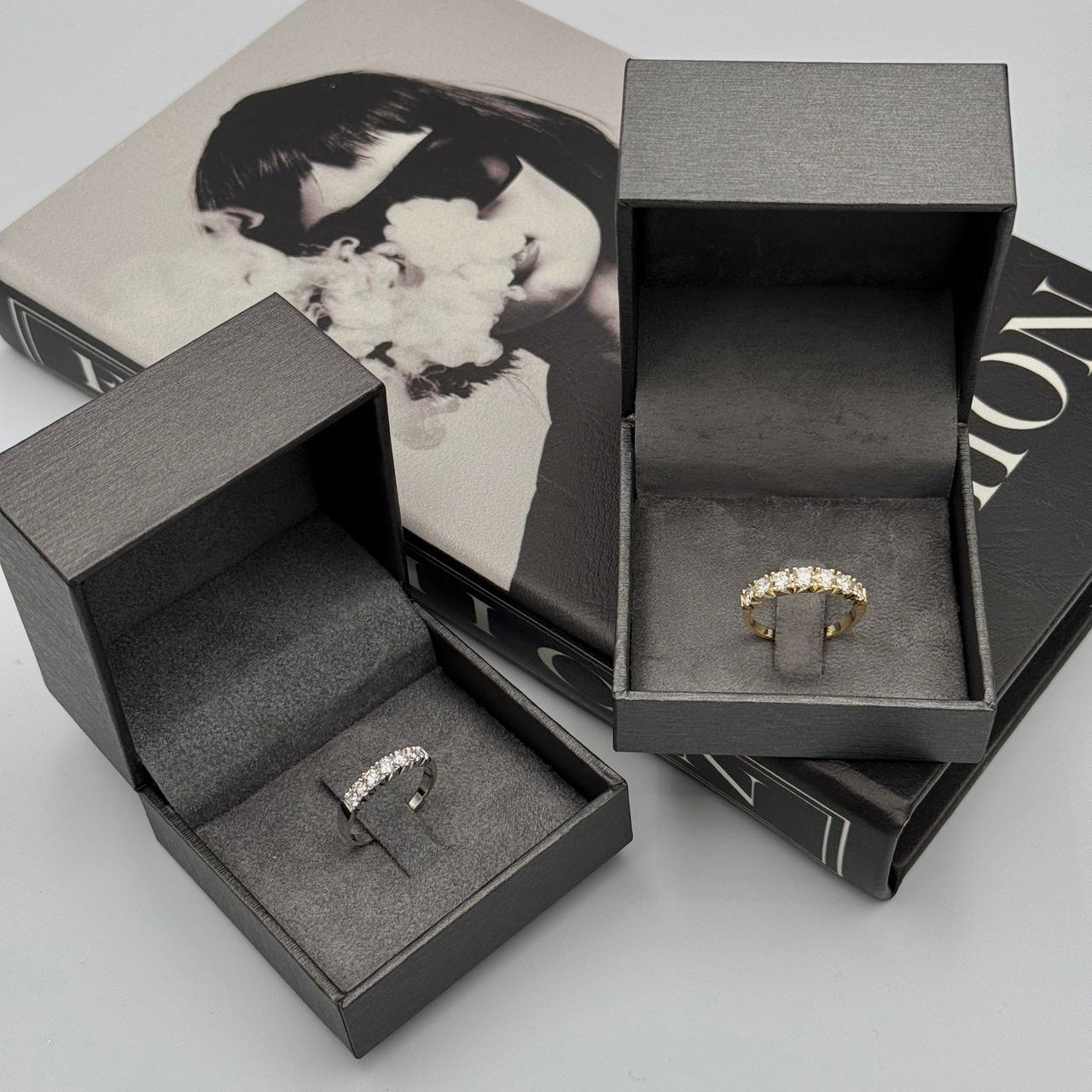 Diamanternas klara glans och det vita guldets svala ton skapar en harmonisk balans som gör ringen till ett iögonfallande smycke. Den subtila elegansen gör den lämplig för både vardagsbruk och festliga tillfällen.