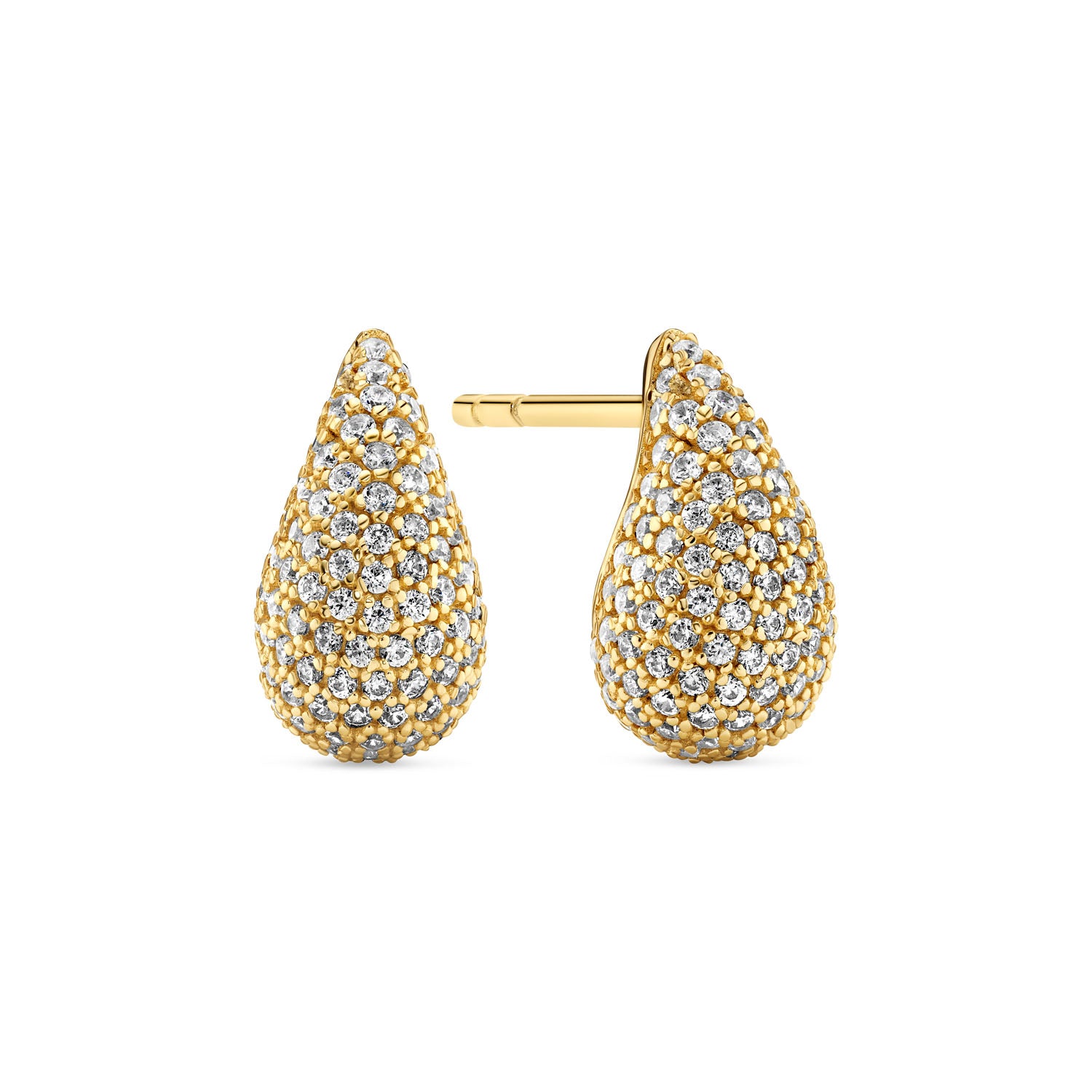 Örhängena har en droppformad silhuett som elegant hänger från örat och framhäver ansiktets naturliga skönhet. Den gyllene färgen i kombination med den klara zirkoniaen skapar en harmonisk balans mellan värme och glans. Detaljerna i designen visar på en noggrann hantverksprecision som gör dessa örhängen till ett konstverk i sig.
