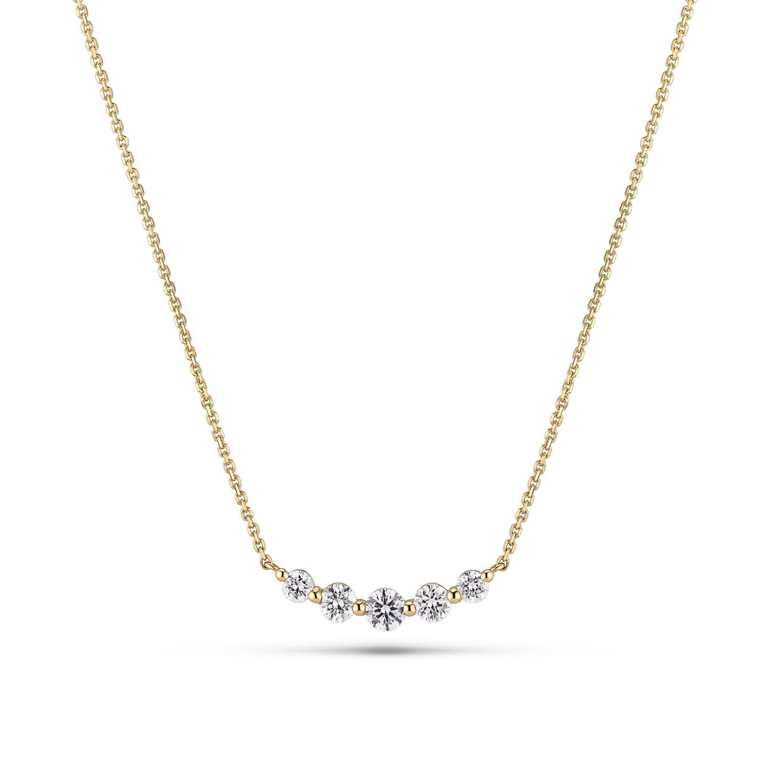 Den fina gyllene guldkedjan framhäver de briljanta diamanterna, som är noggrant placerade för att skapa en harmonisk balans. Guldets subtila glans kompletterar diamanternas starka ljus, vilket gör halsbandet till ett iögonfallande smycke.