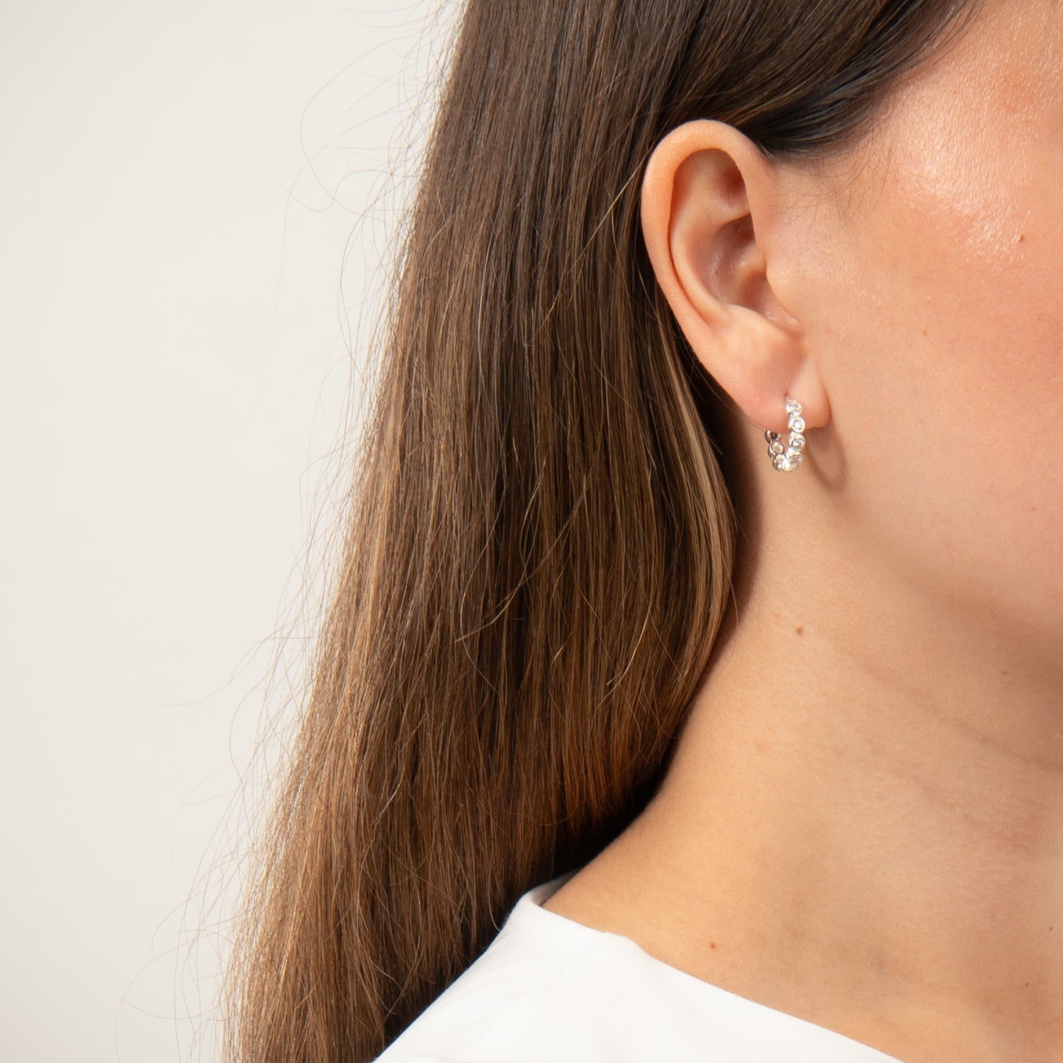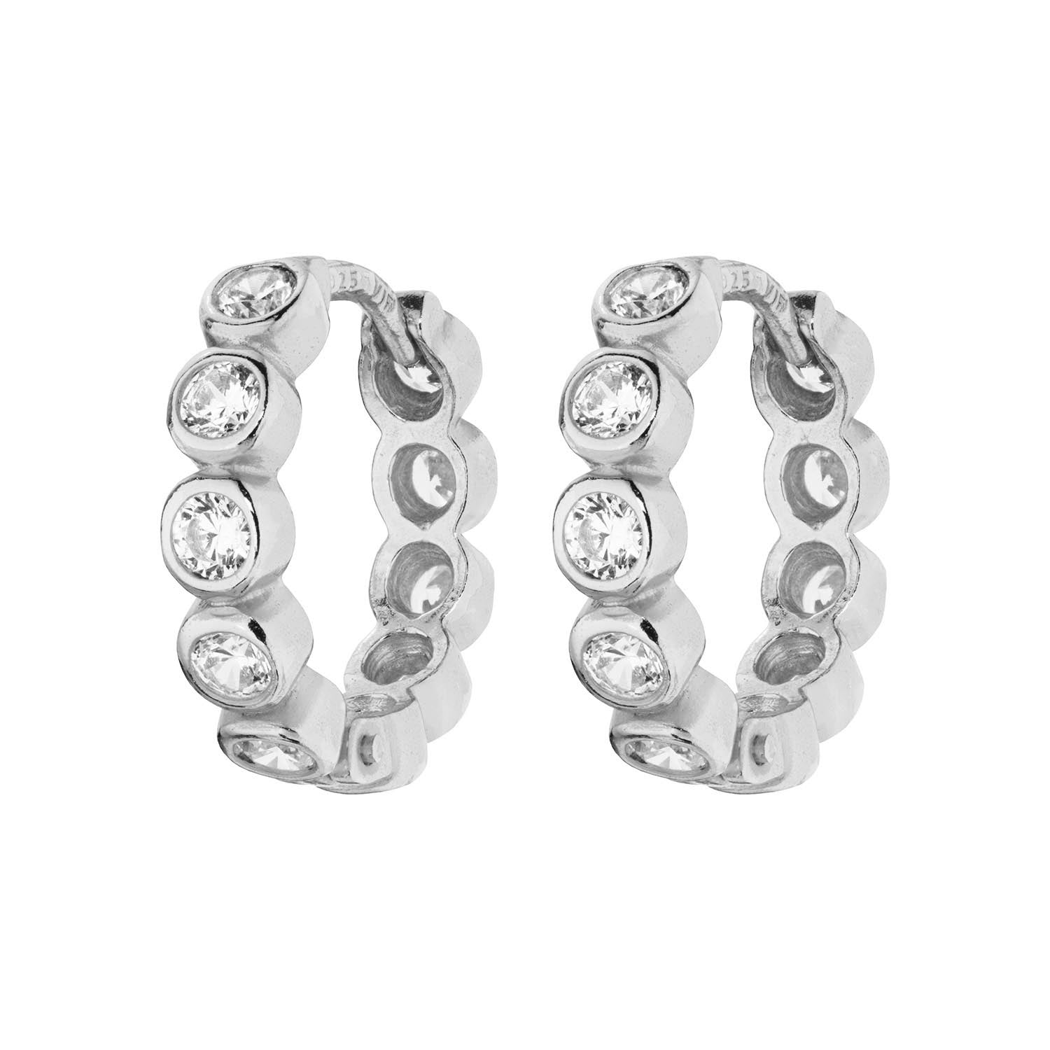 Dessa klickringörhängen är tillverkade av silver och prydda med glittrande kubiska zirkoniastenar för en sofistikerad look. Silvrets släta yta och klara glans skapar en lyxig känsla, medan kubiska zirkoniastenarna ger en subtil men iögonfallande glans.