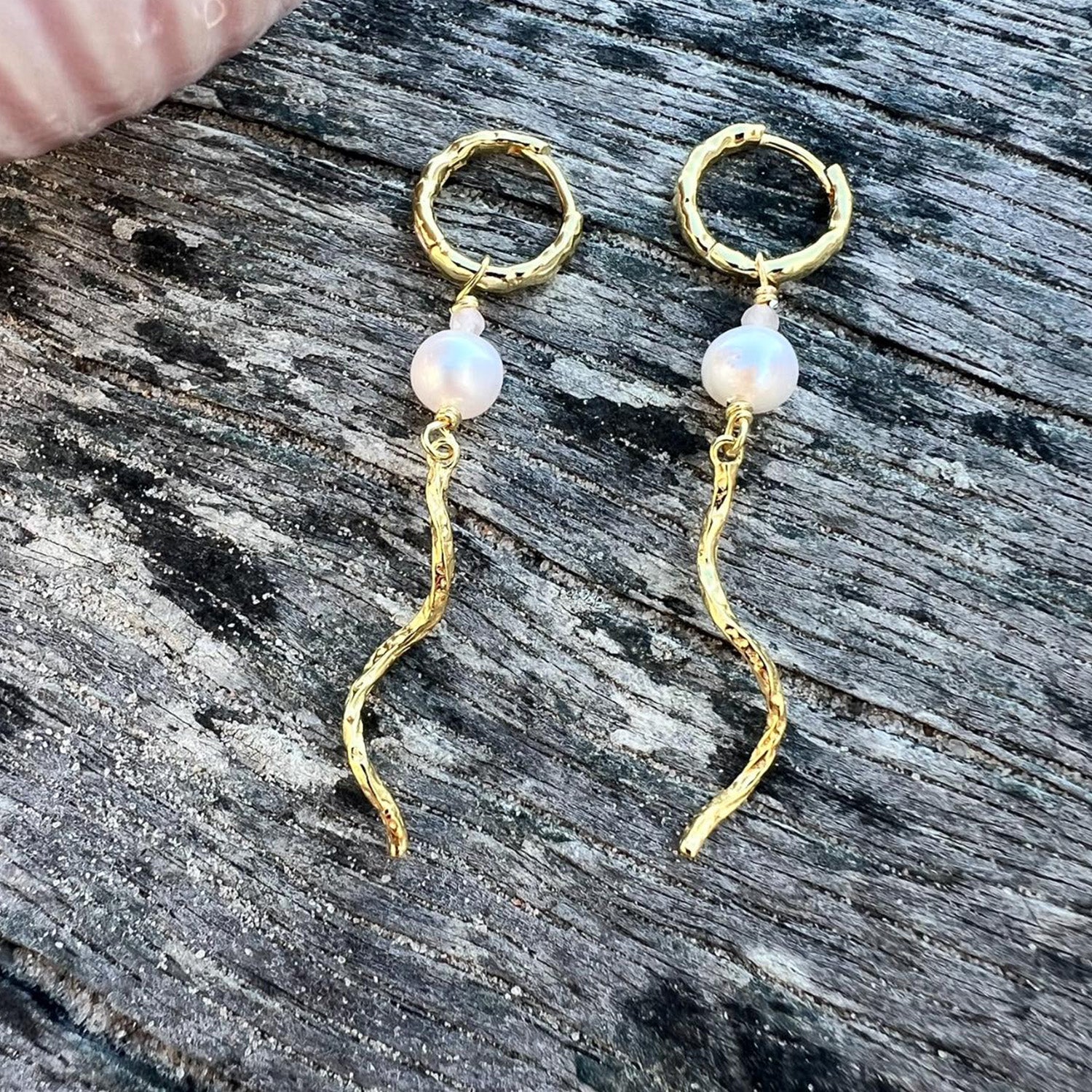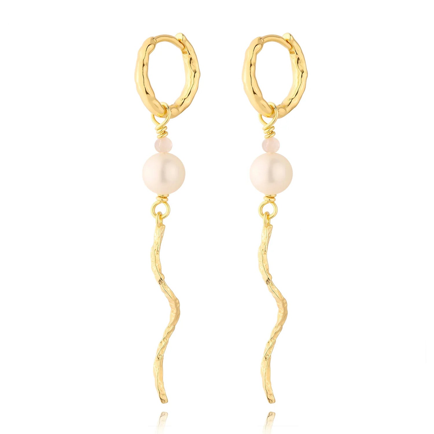 Disse øreringe har en smuk gylden nuance, der fremhæver deres forgyldte sølvmateriale. Den delikate perle og den snoede form giver et unikt og iøjnefaldende look. Øreringene hænger elegant fra øret og bevæger sig let, hvilket tilføjer en dynamisk dimension til dit outfit.